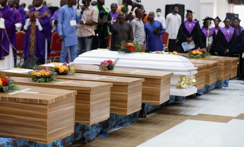 Flowers lie on caskets during a funeral Mass in the the parish hall of St. Francis Xavier Church in Owo, Nigeria, June 17, 2022. The Mass was for some of the 40 victims killed in a June 5 attack by gunmen during Mass at the church. 52,250 people have been killed over the last 14 years in Nigeria only for being Christians, a new report published April 10 revealed (OSV News photo/Temilade Adelaja, Reuters)