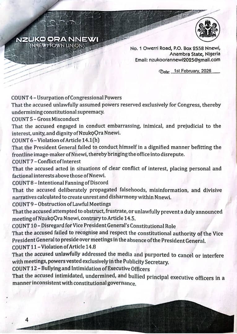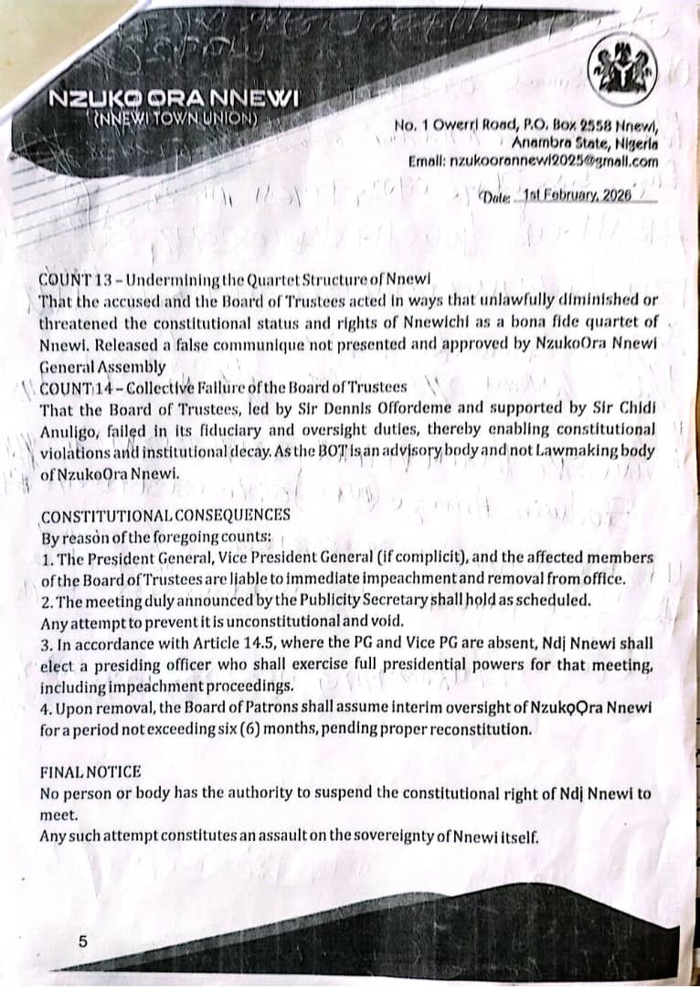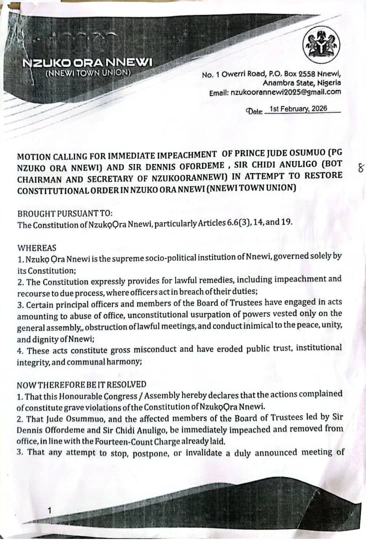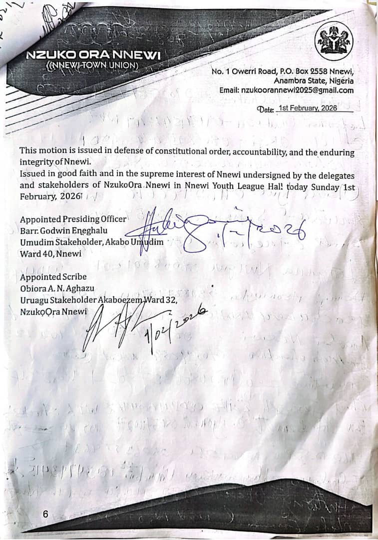 The Nzuko Ora Nnewi which is the parent body governing Nnewi Town in Nnewi North have today 1st February, 2026 passed a vote of no confidence on the President General (Prince Jude Osumuo) and BoT Chairman Chief Dennis Offordeme over their attempt to unlawfully extend the tenure of the Local Government Mayor of Nnewi North Hon Echezona Anazodo.
