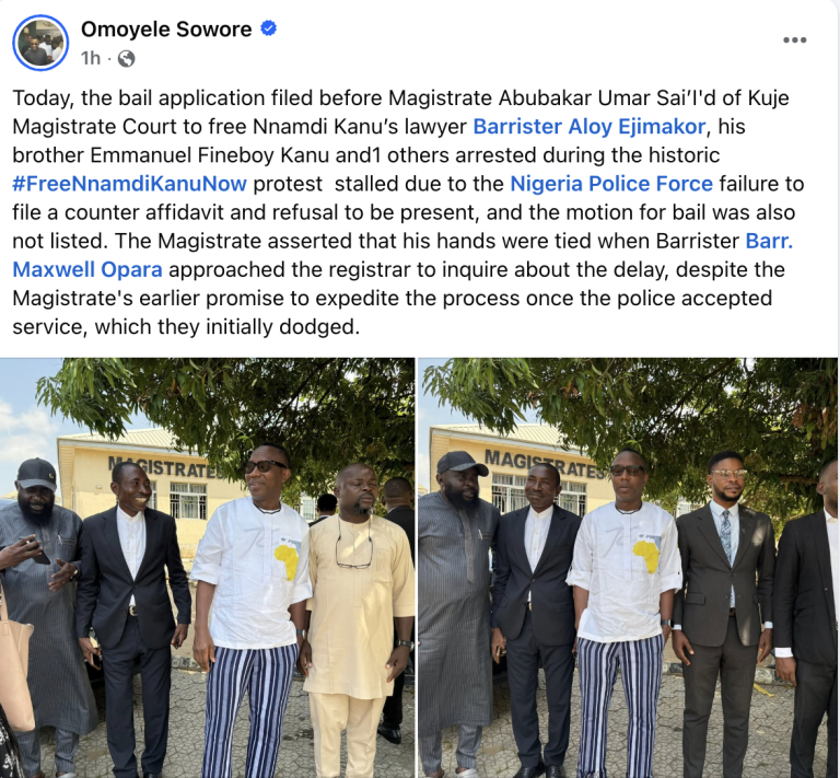 The bail hearing for the lawyer to detained IPOB leader, Nnamdi Kanu, Barrister Aloy Ejimakor, and his brother, Emmanuel “Fineboy” Kanu, was on Wednesday stalled at the Kuje Magistrate Court following the failure of the Nigeria Police Force to appear or file a counter affidavit.