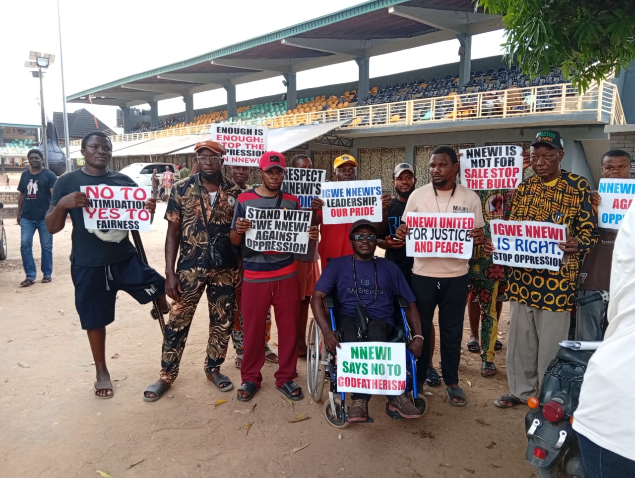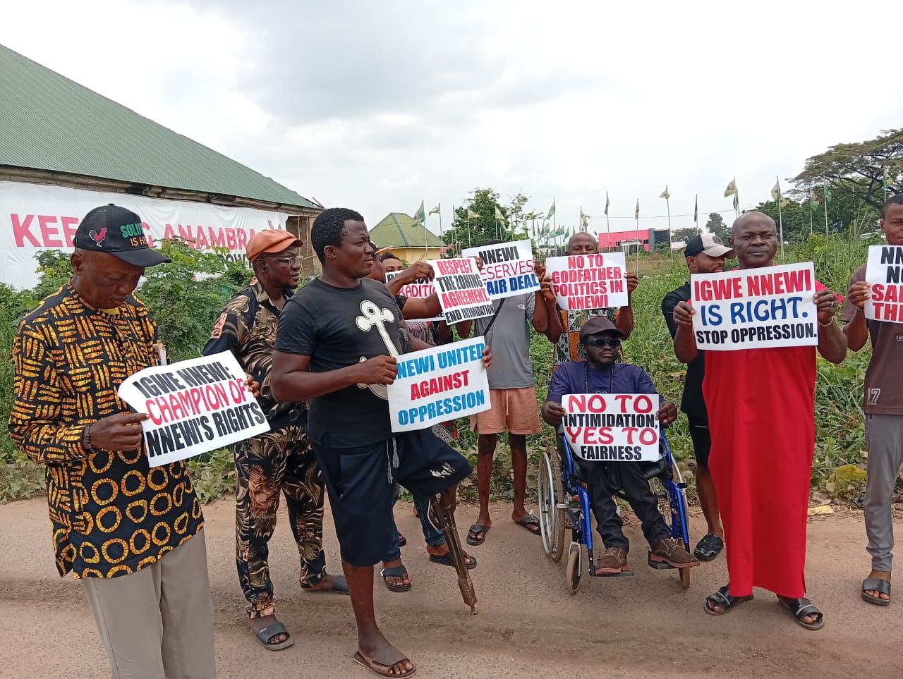 At the APGA office in Awka, the demonstrators were seen carrying placards with different inscriptions such as “Nnewi United Against Oppression”, “1997 Zoning Agreement must be respected “, “Respect Our ur Tradition, Respect the Zoning Agreement”, ” Nnewi Deserves a Fair Deal”, “Igwe Nnewi Champion of Nnewi ‘s Rights”, “Nnewi is not for Sale, stop the bully”, “Igwe is right stop oppression”, “No to Godfather Politics in Nnewi”, among others, to the Government House, Awka, but found the gates locked because of public holiday. They drove to the party state office to appeal to the ruling party to reconsider their steps and zone the local government Chairmanship position to Nnewichi in accordance with the zoning agreement but were stopped by the state actors from entering the state party office.