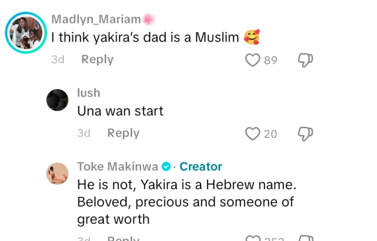 Reacting to Toke’s TikTok post, a fan claimed that the father of her baby is a Muslim because of her name, Yakira.